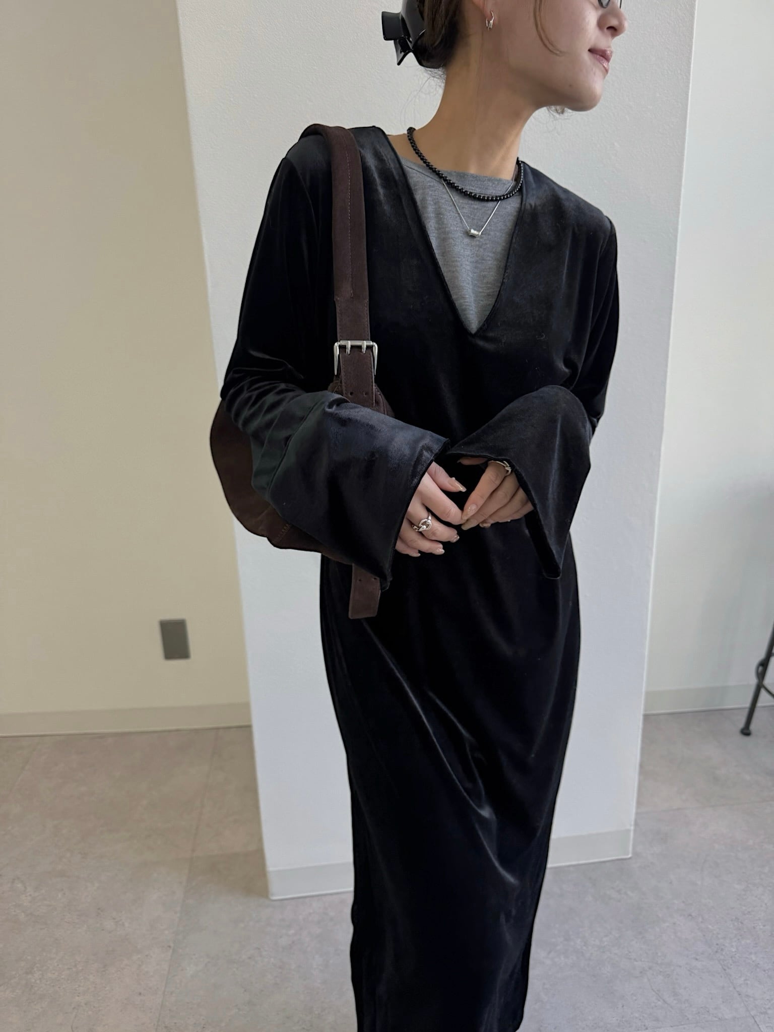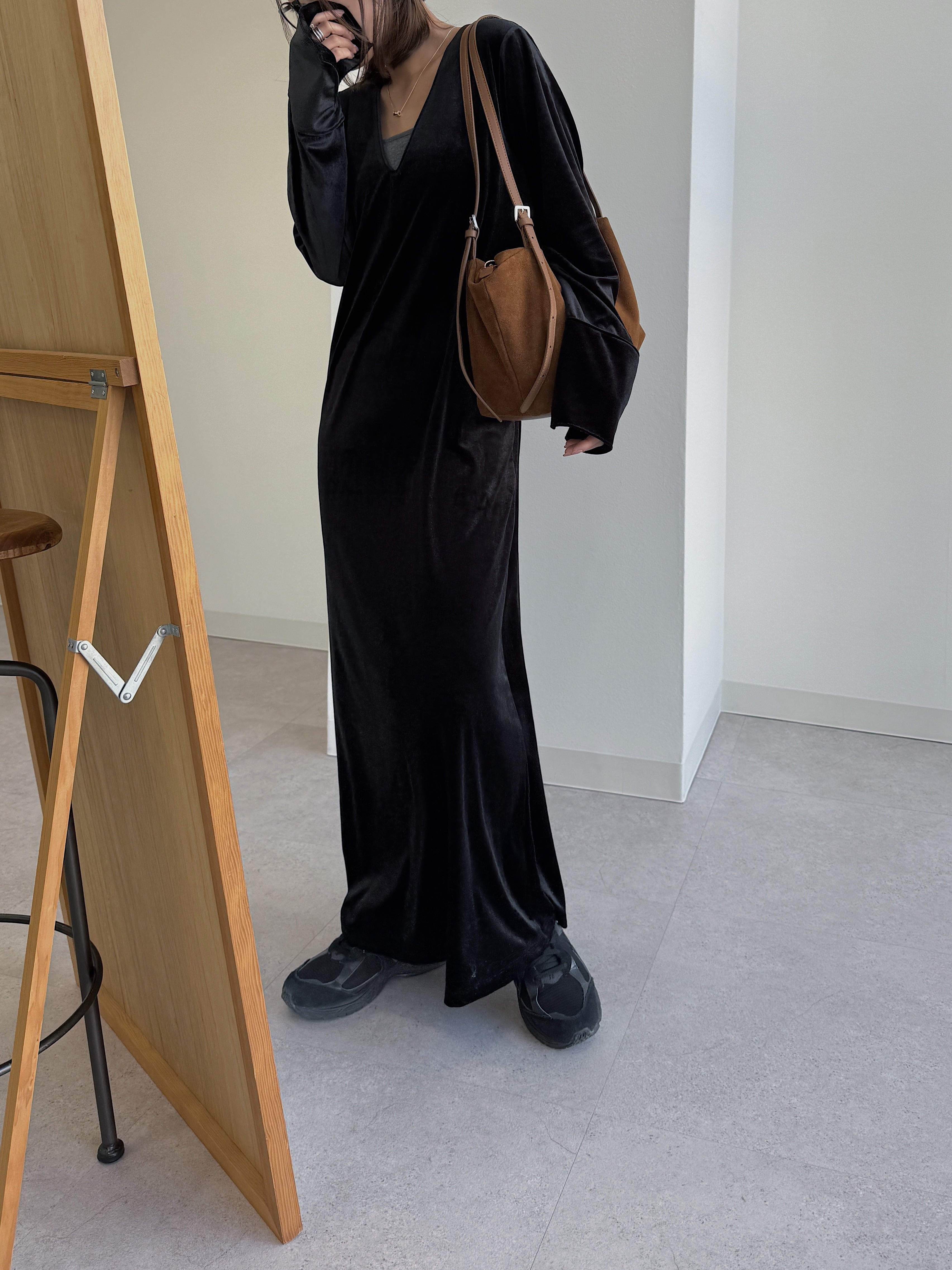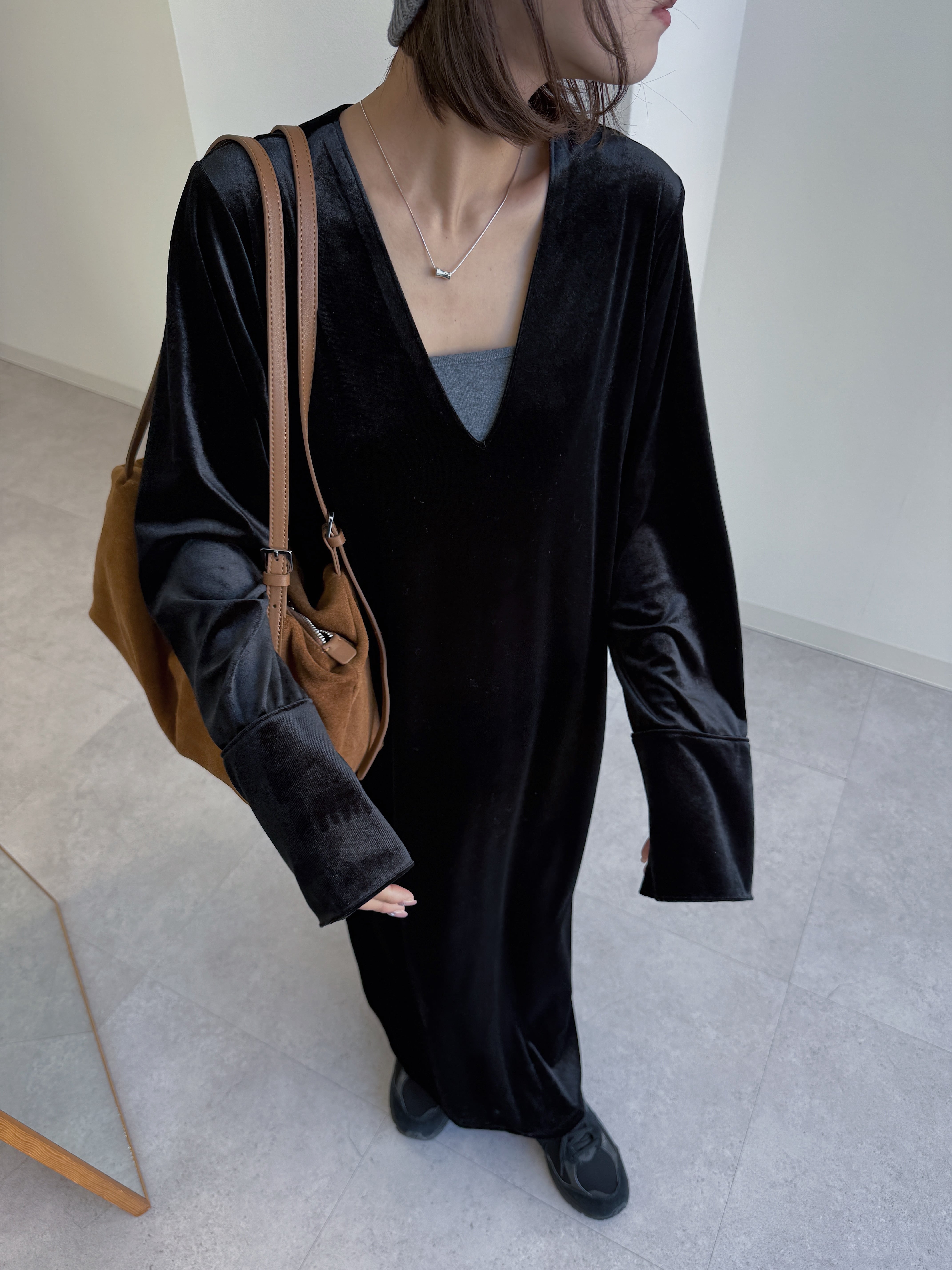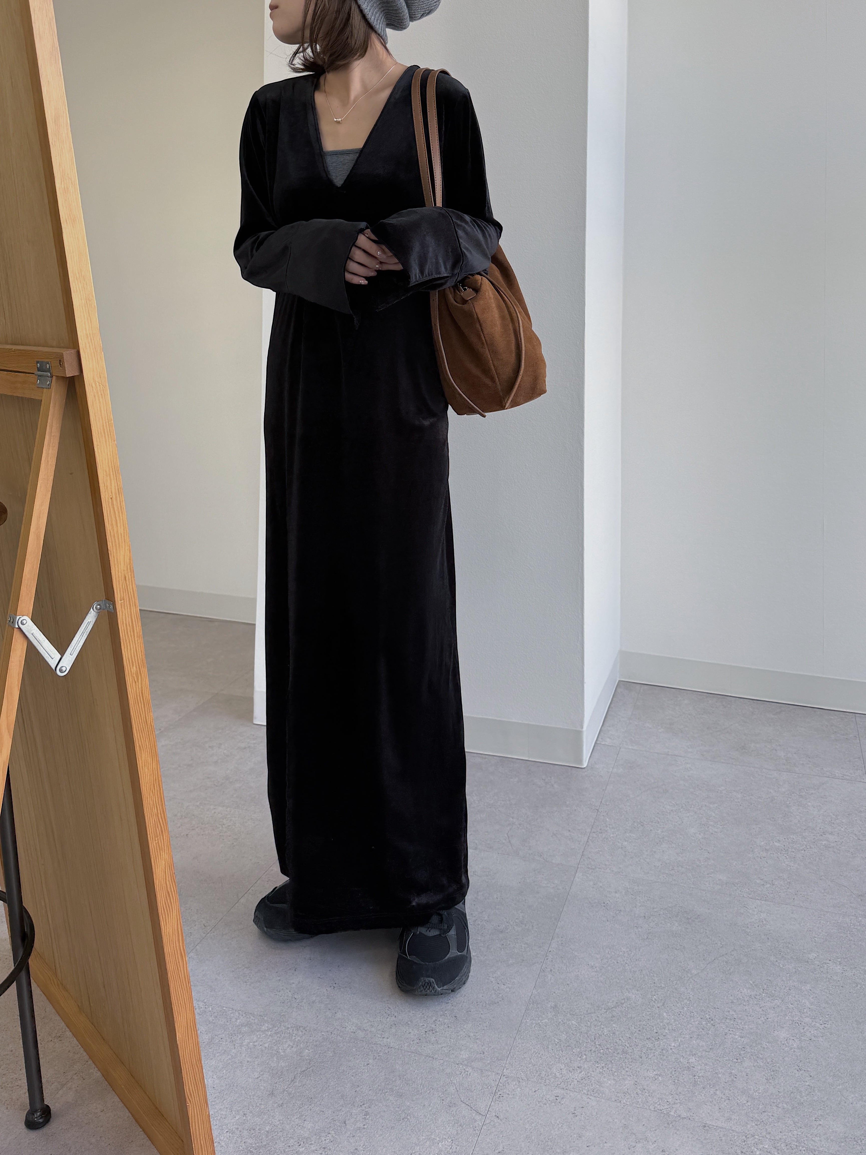 動くたびにベロアがしなやかに揺れる大人な雰囲気漂う1着。
