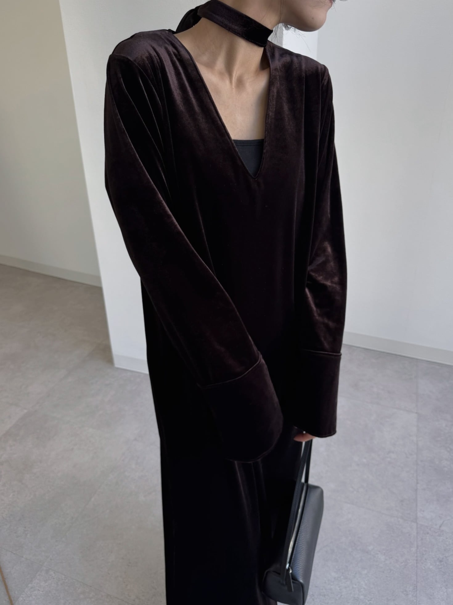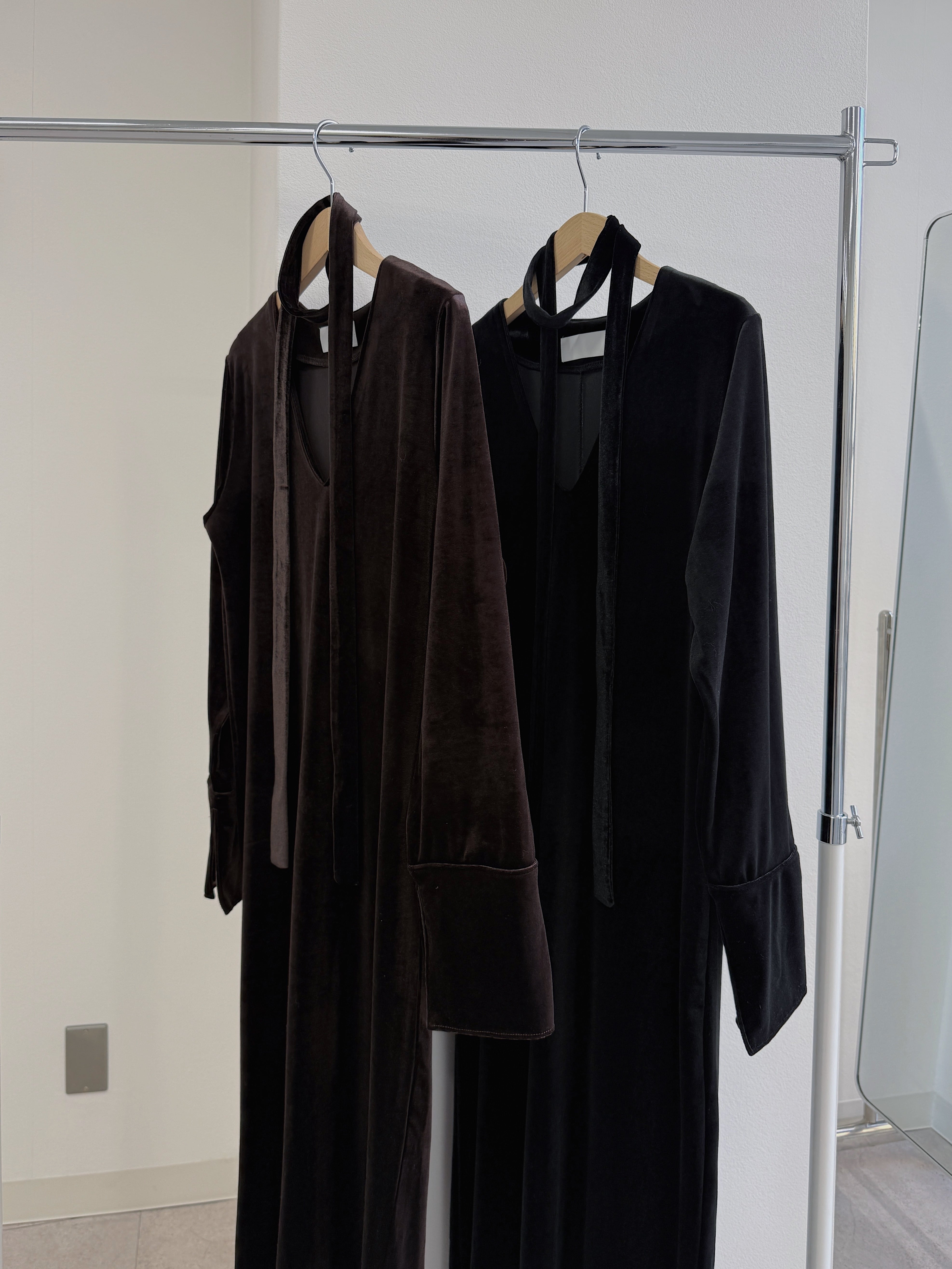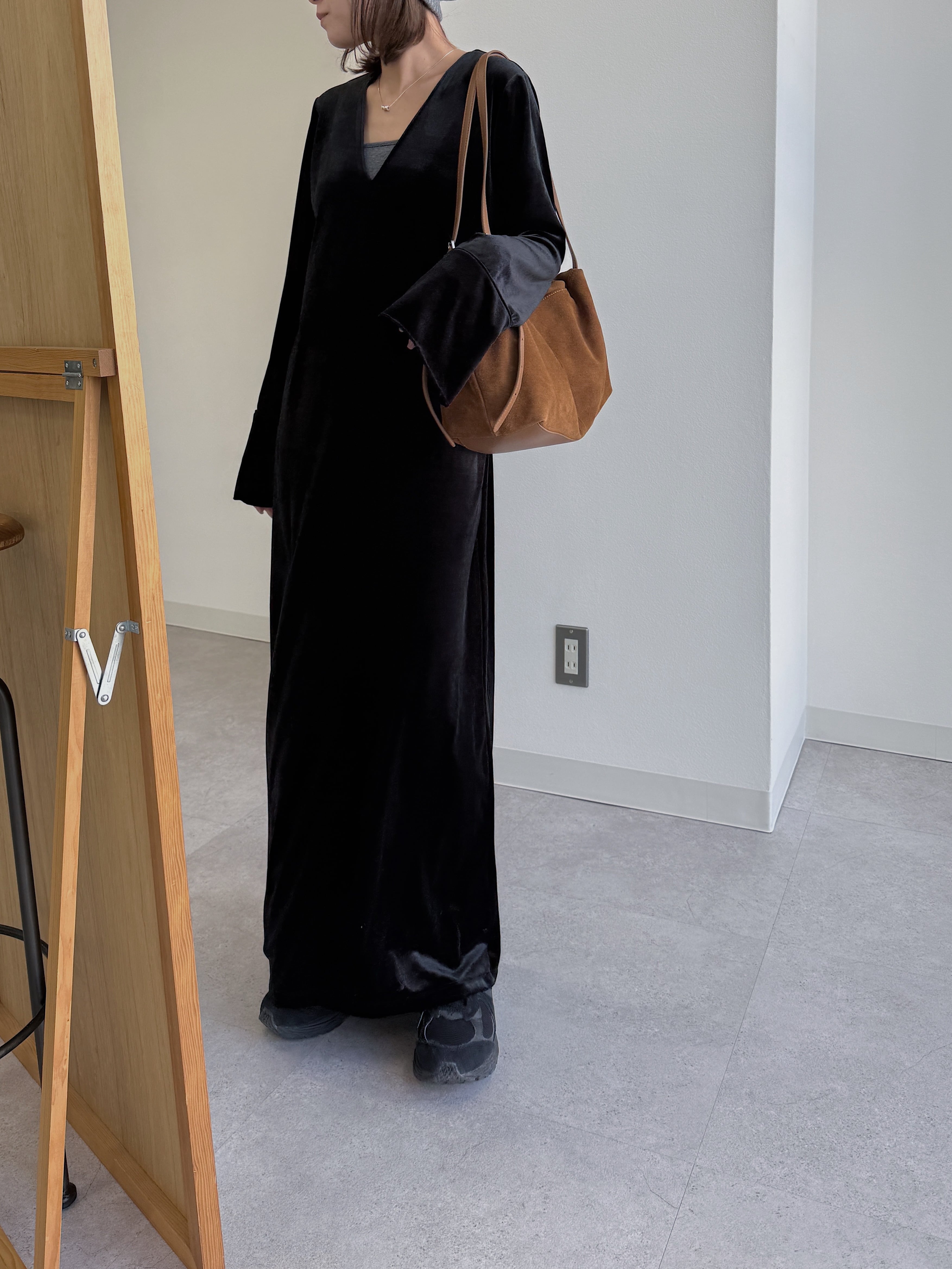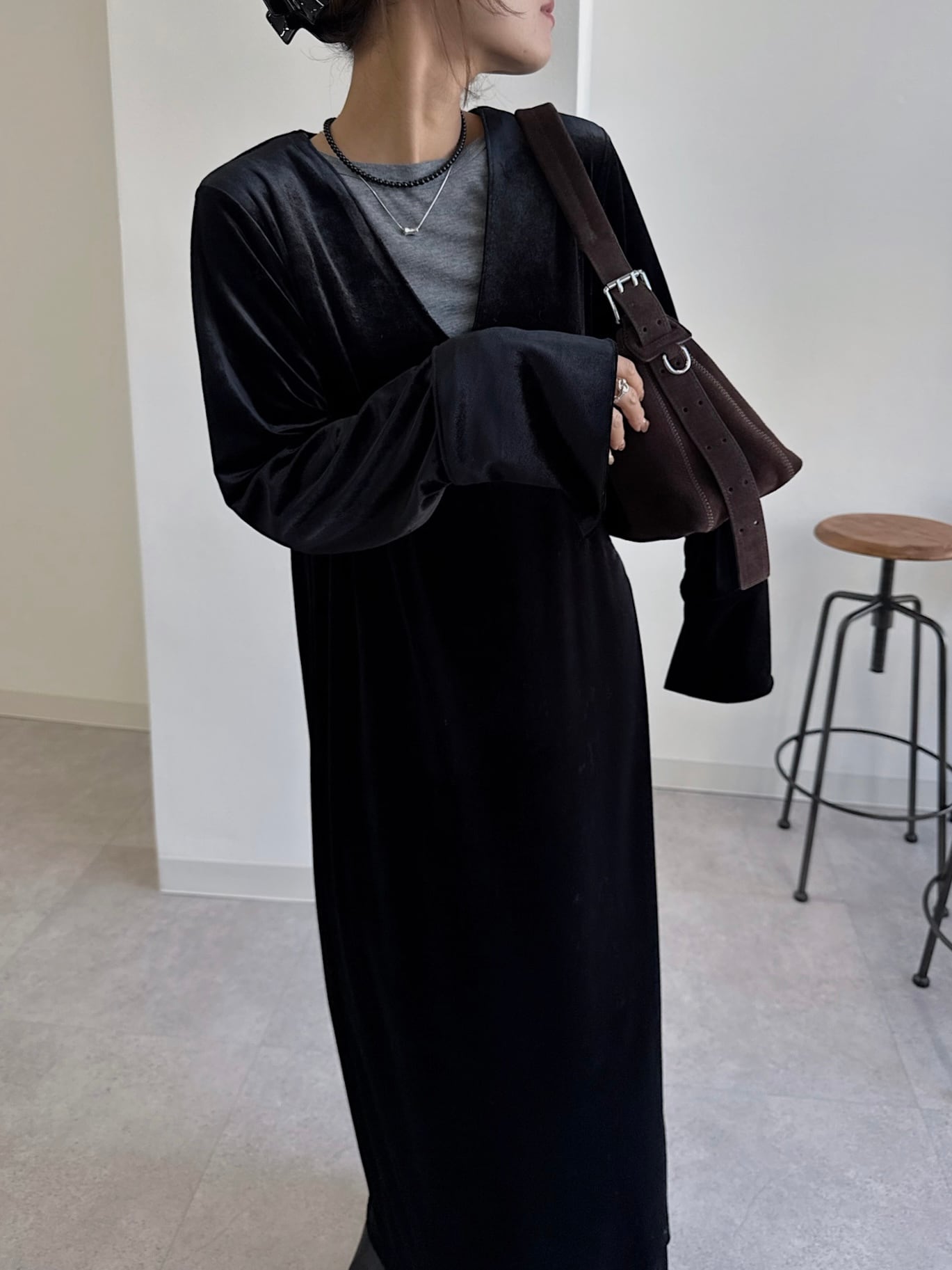動くたびにベロアがしなやかに揺れる大人な雰囲気漂う1着。
