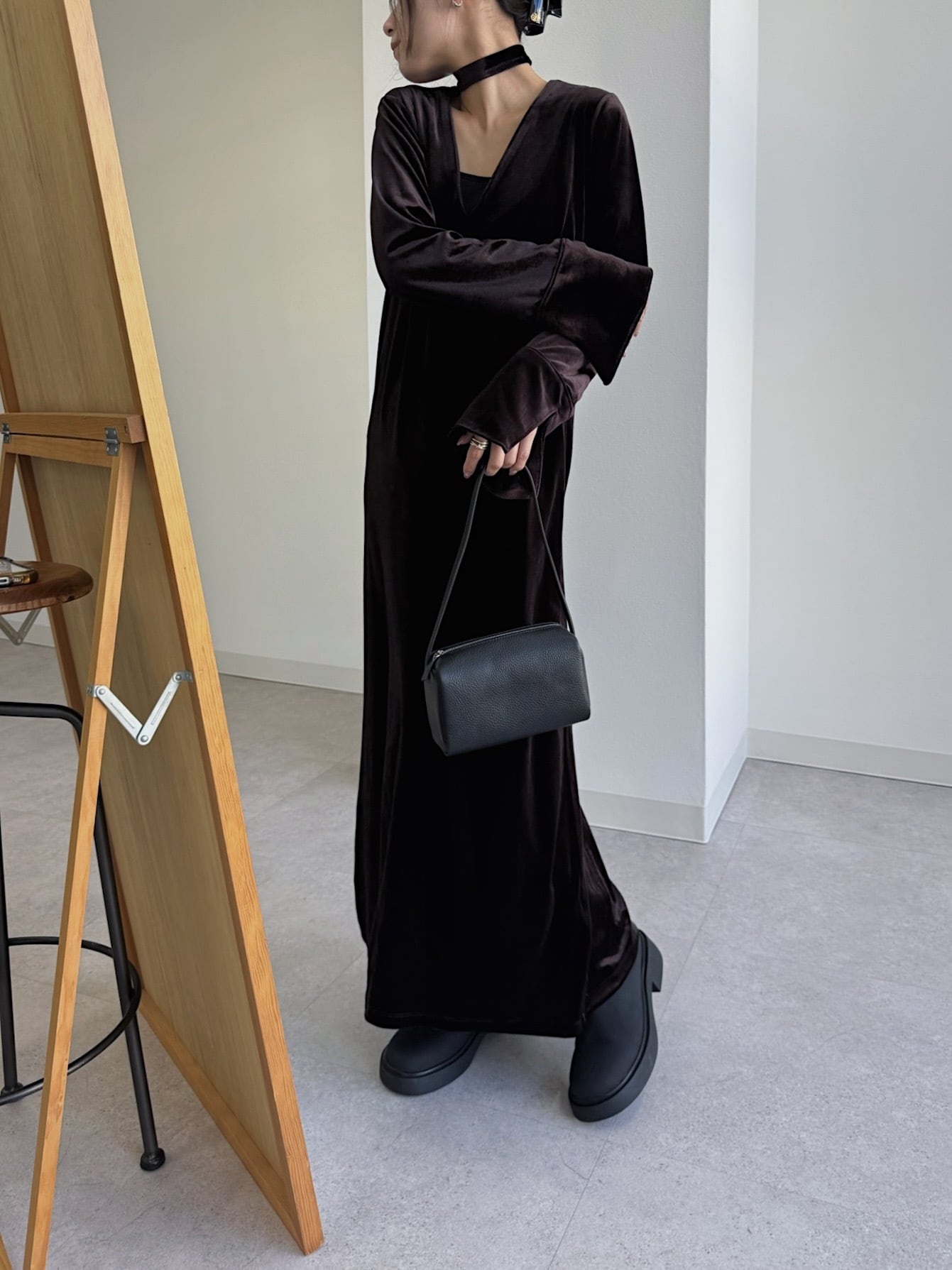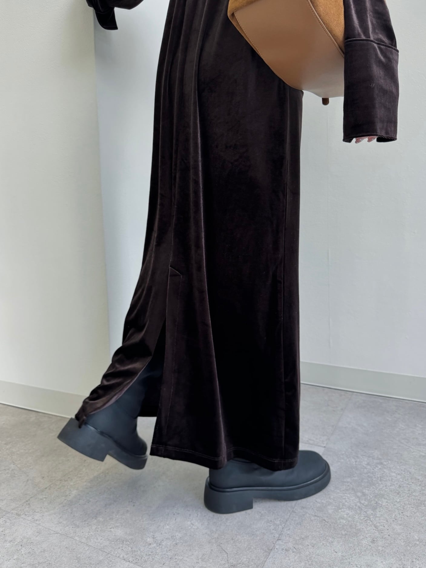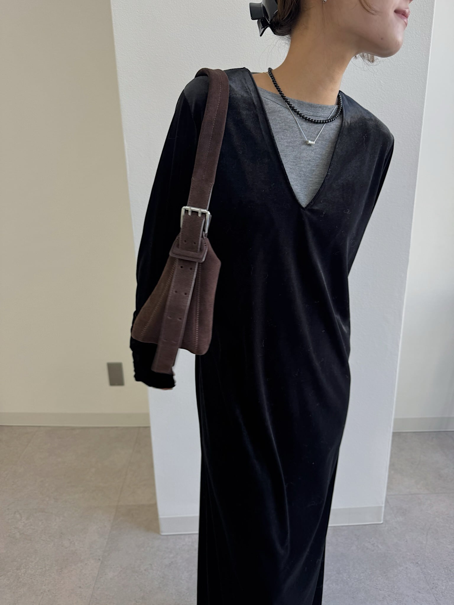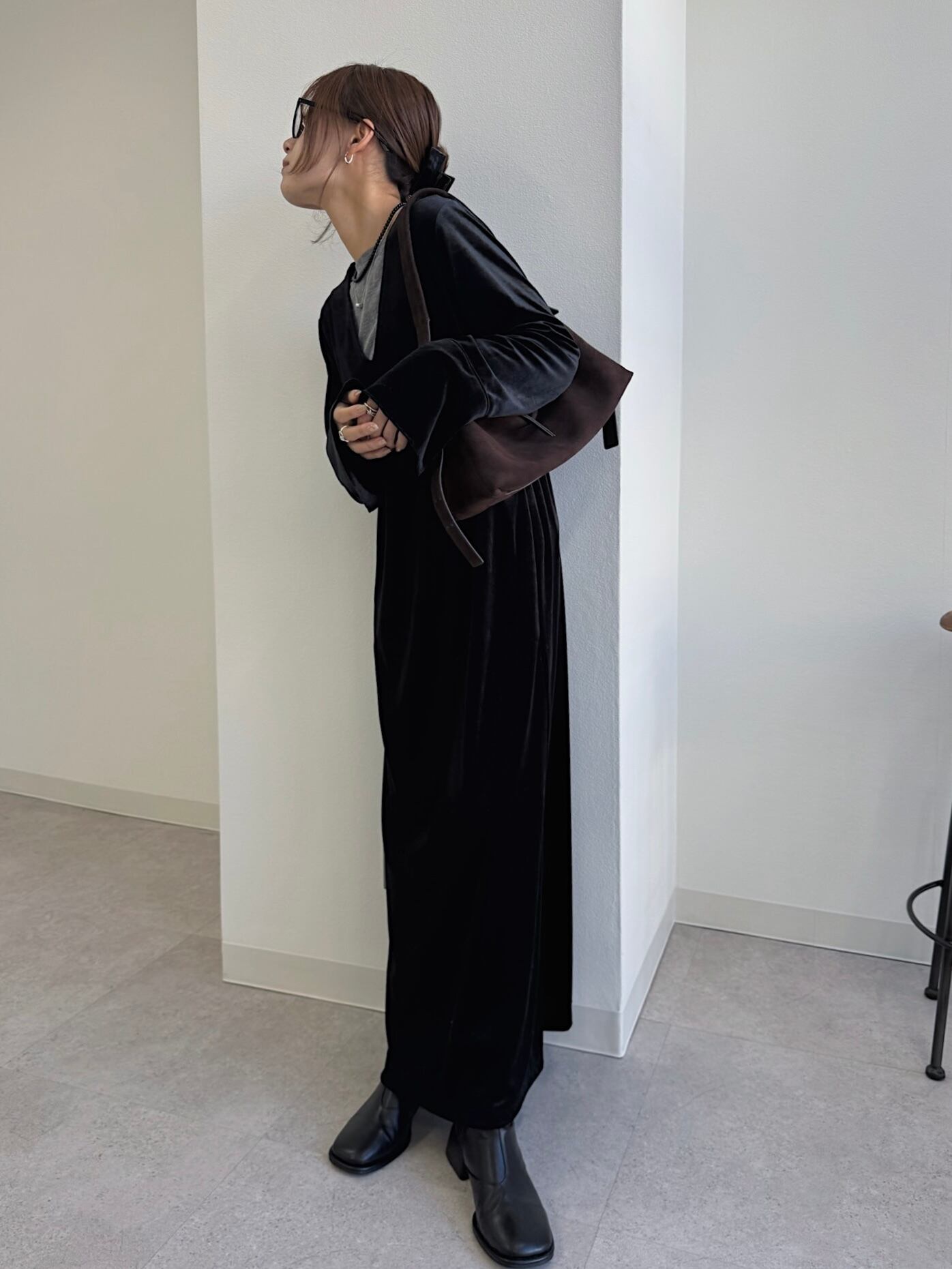 動くたびにベロアがしなやかに揺れる大人な雰囲気漂う1着。