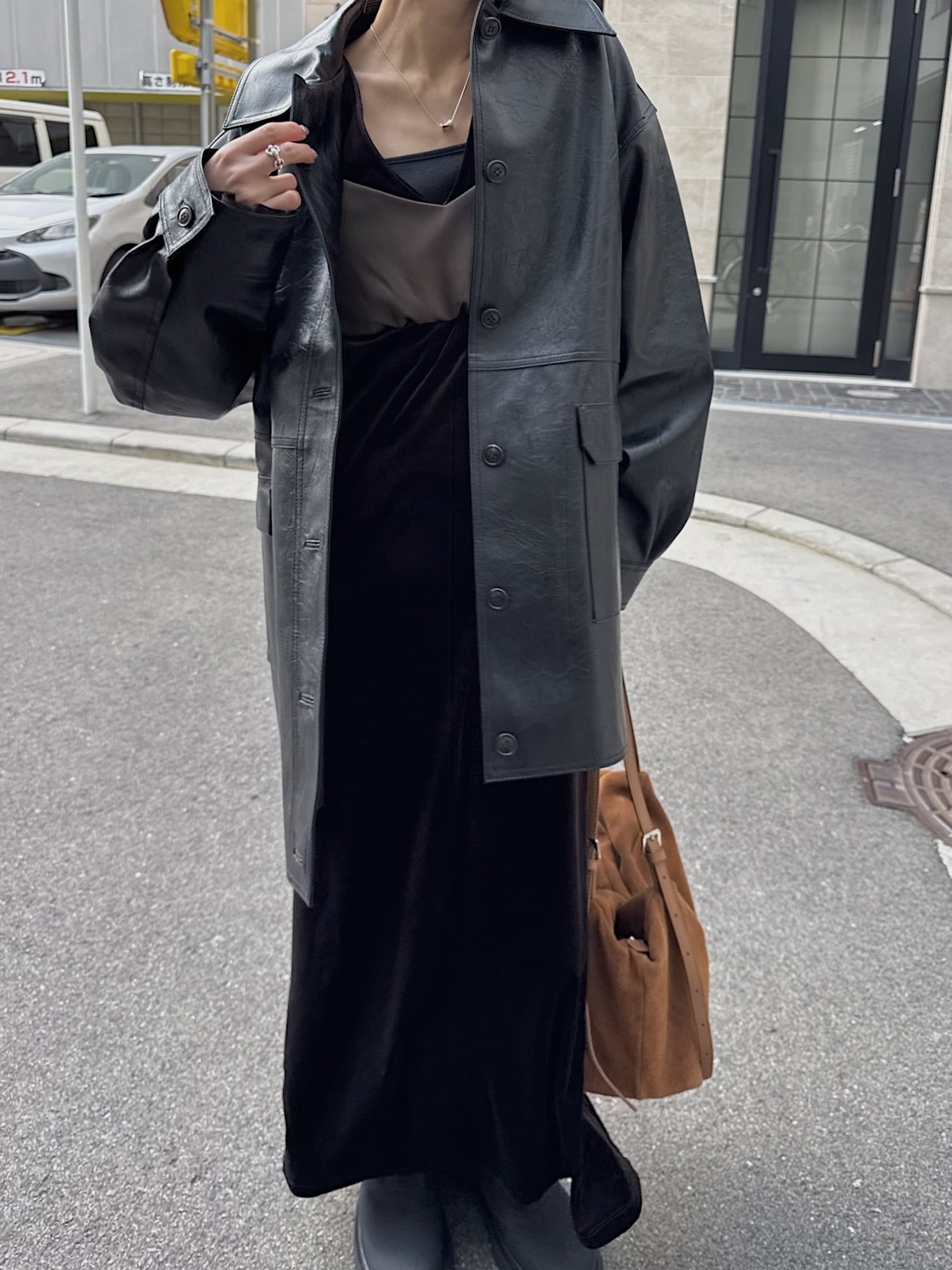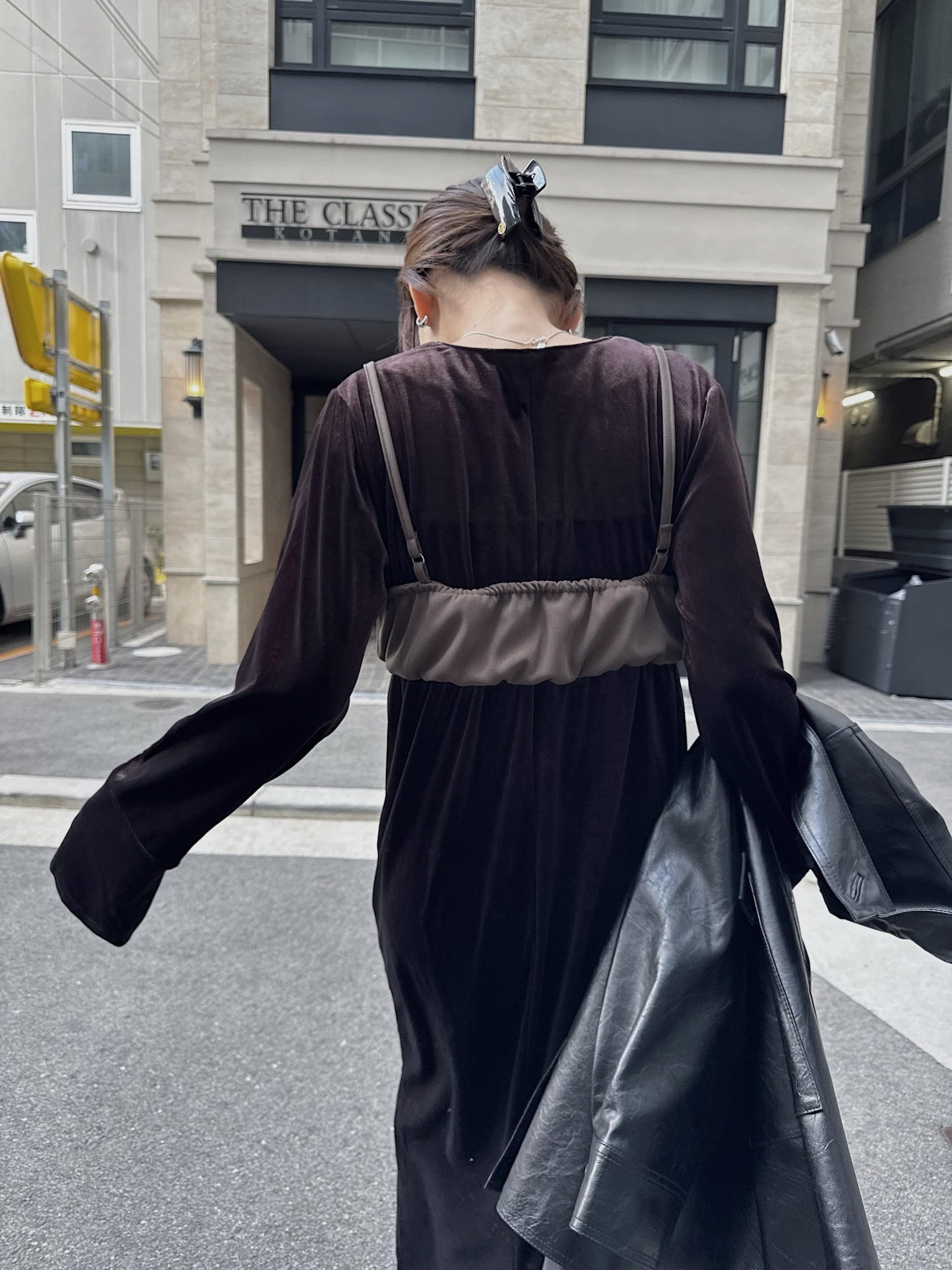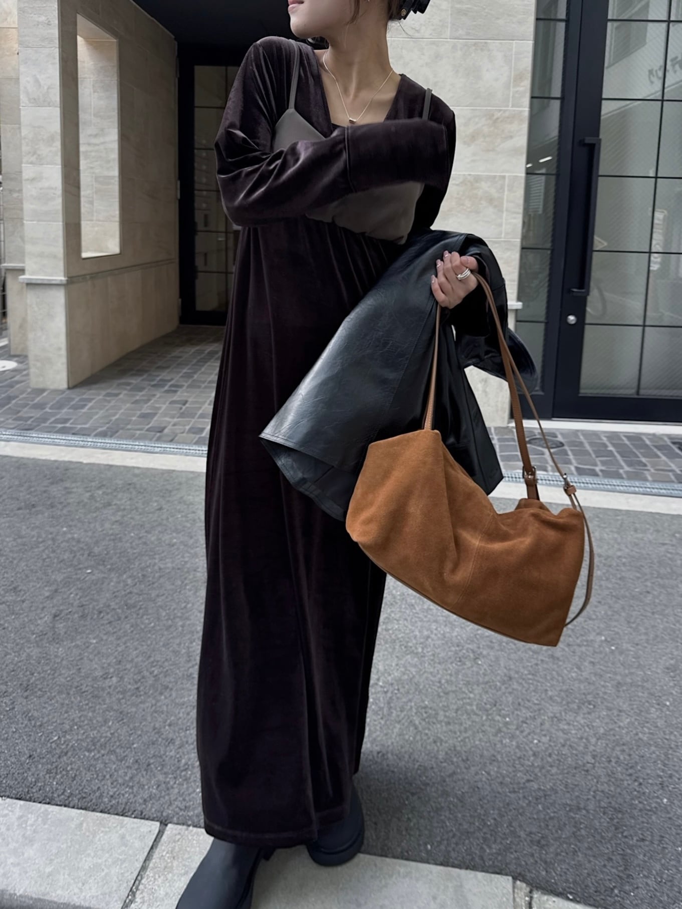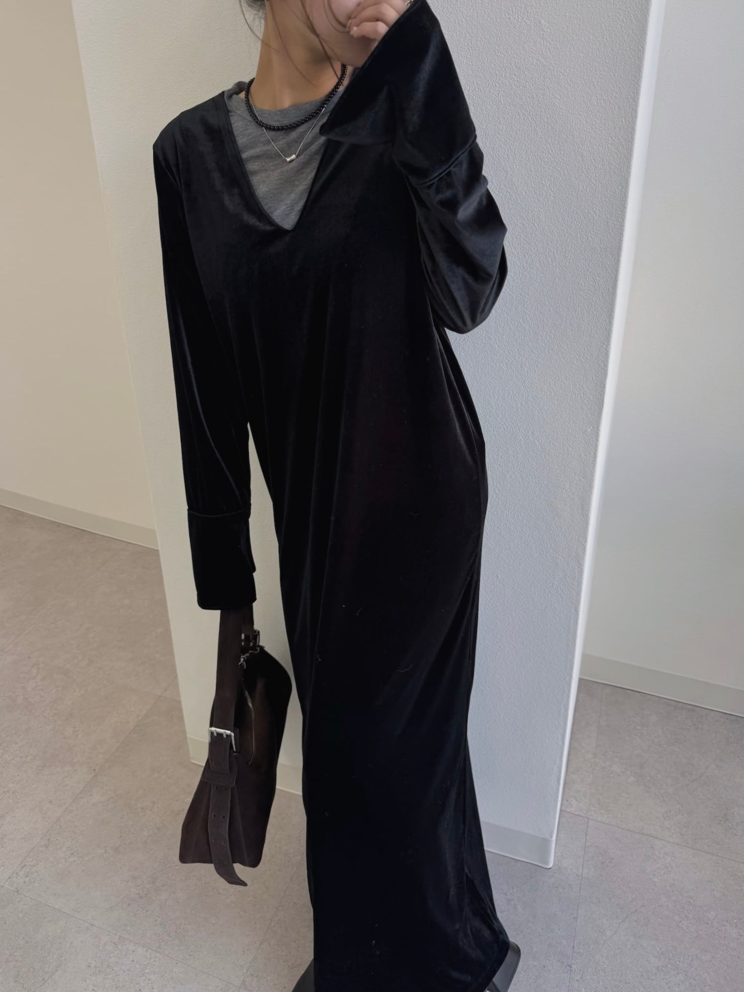 動くたびにベロアがしなやかに揺れる大人な雰囲気漂う1着。
