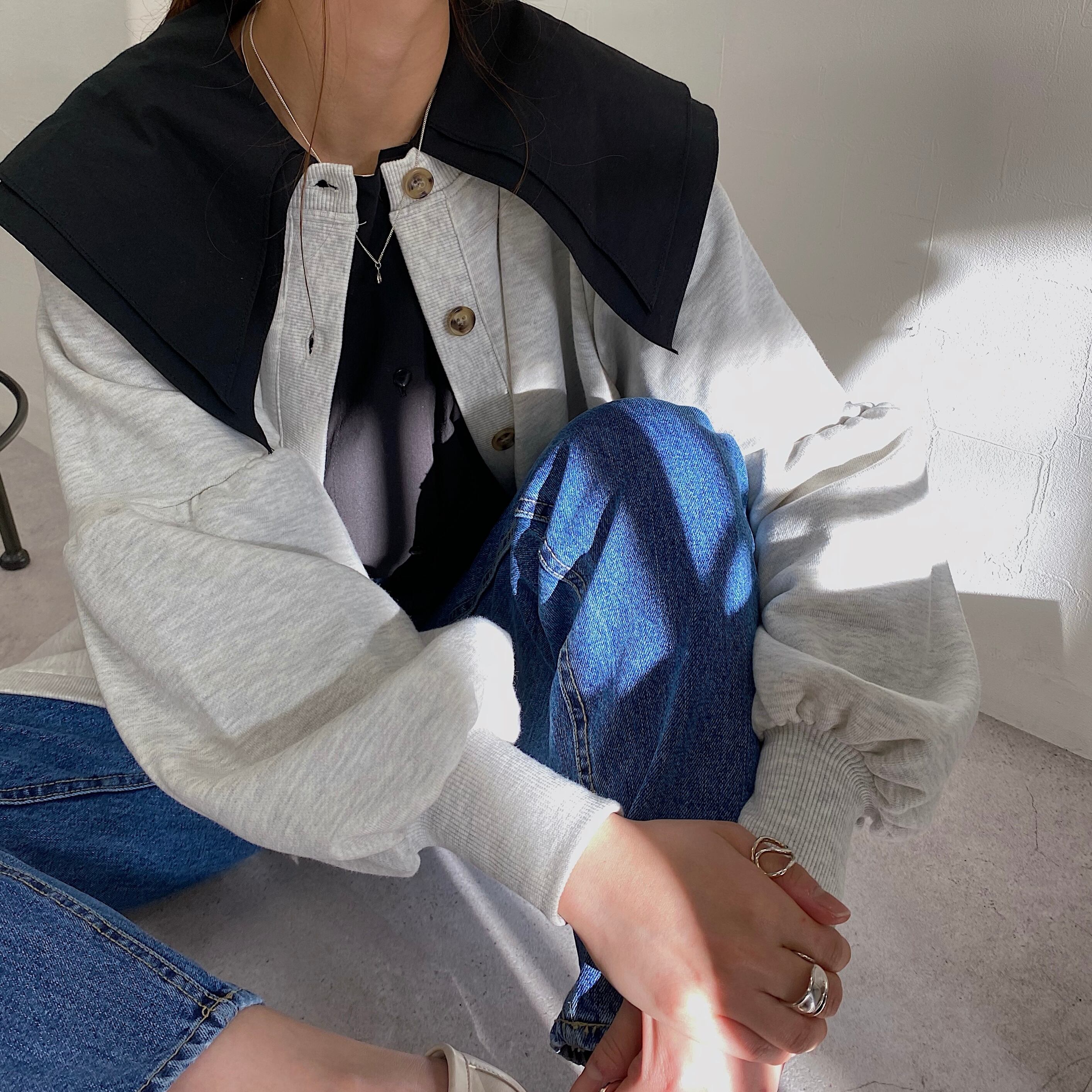 ブラウスの上からニットやスウェットを重ねて頂くのはもちろん、