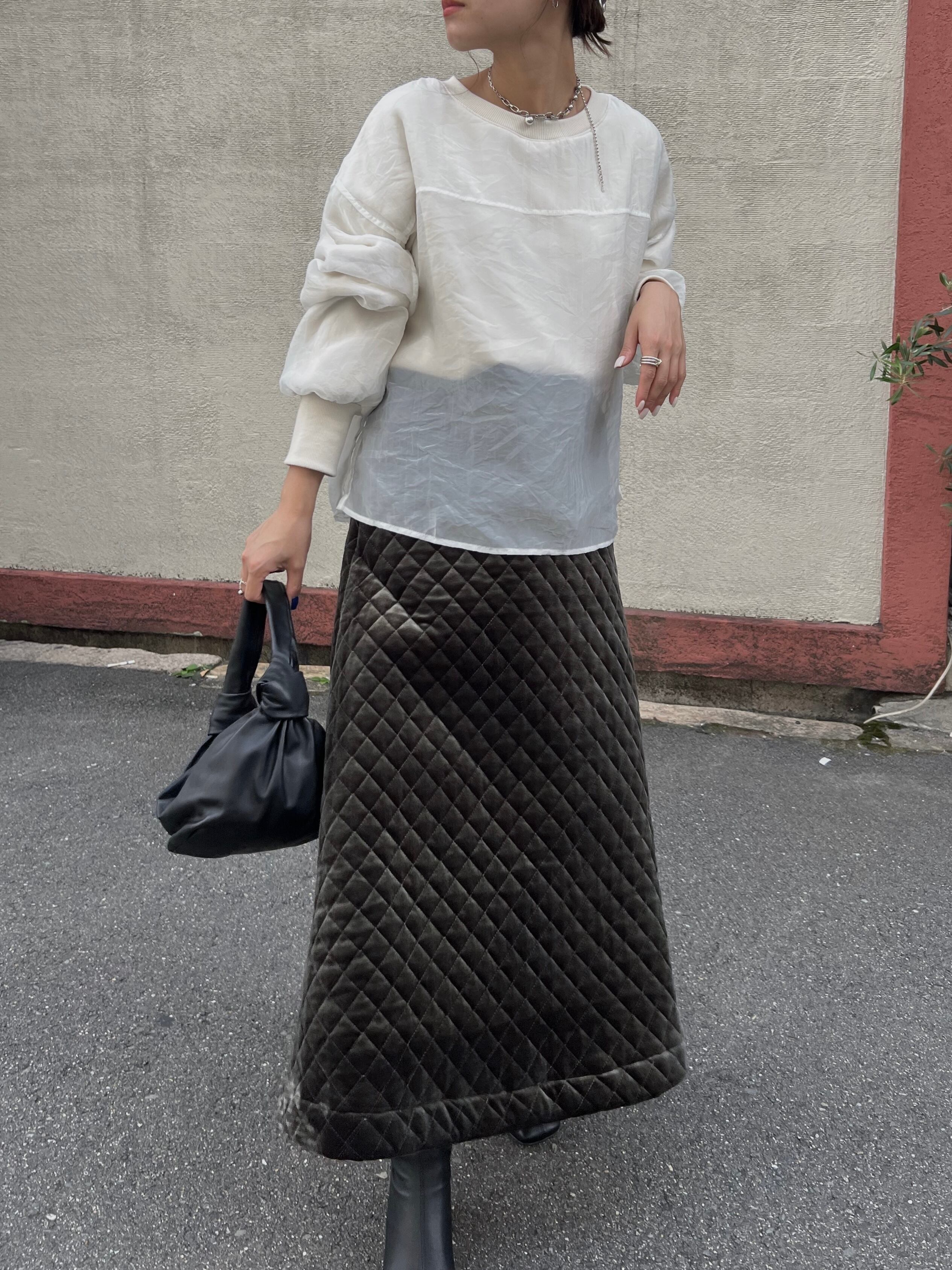 ベロア生地に立体的なキルティングデザインを施したロングスカート。