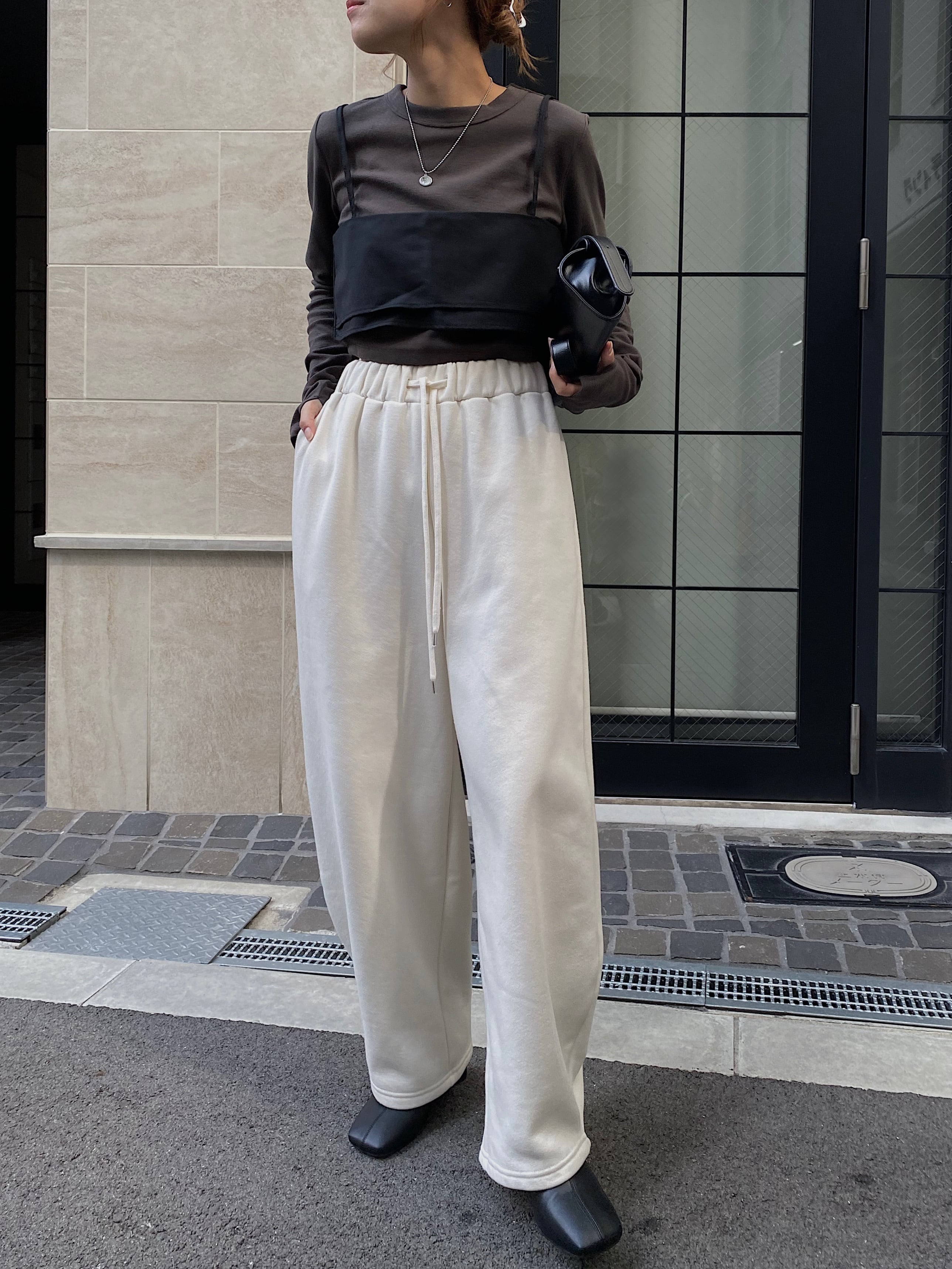 スウェットやニットを合わせ、とことんカジュアルなスタイルや